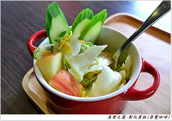 沙拉的擺盤跟用料光用看的就讓我頗為喜歡,鮮脆、清甜、生菜跟水果都非常新鮮好吃 !! 微酸、爽口、油醋醬的搭配也算得宜 !! 總歸一句老話,生菜沙拉只要食材新鮮東西就不會難吃,因此原覺咖啡的沙拉是絕對ok的。