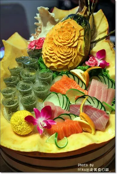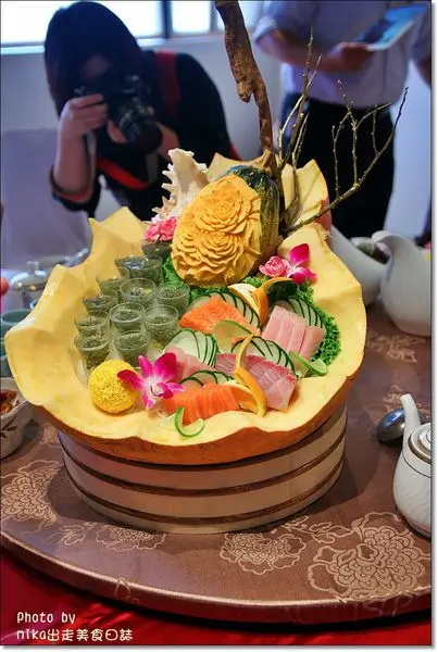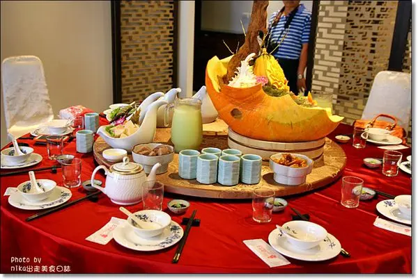 有沒有這麼大的南瓜,我的媽呀,這應該是美國南瓜品種,聞起來還是新鮮的南瓜香氣,可見這一顆是新的,沒有重複使用過呢!小南瓜還有雕花,超美的裝盤,讓人家光看就飽了,宜蘭的無菜單料理擺盤都挺豪華的。