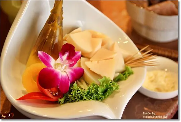 其實大家仔細看那盤飾,這是陳主廚自己設計的喔,一個就要兩千元以上的成本了,那造型是以花瓣做發想,有流線造型還有愛心的形狀,但其實它就是花瓣,擺成一個圓圈時就是一朵花了,真的是很美的盤飾阿!