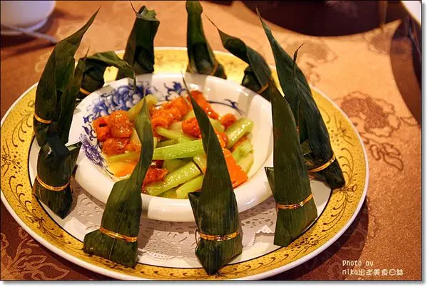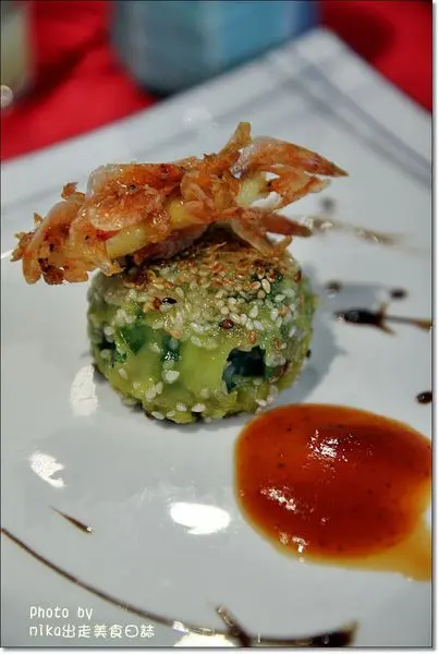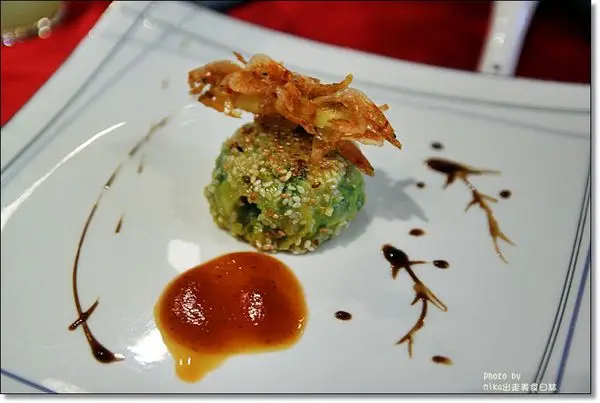 吃起來很像燒賣的蝦餅,其實是以三星蔥與櫻花蝦等做成的,那擺盤非常有藝術感。
