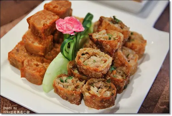 肝花是類似肉捲的東西,首先使用魚漿、絞肉與香蔥等增加豐富度,然後再用豬油網包裹油炸,吃起來有濃濃的胡椒與蔥香,真的很像肉捲,很鮮很鹹香,口感層次很豐富。