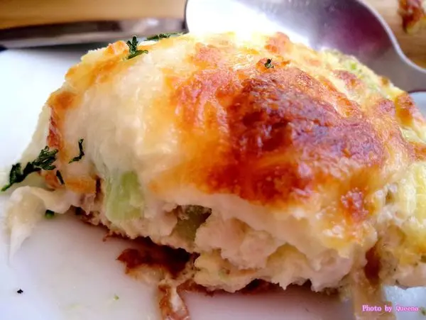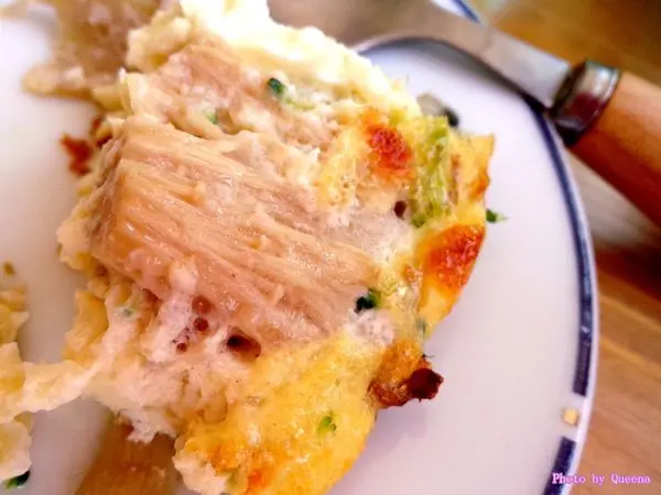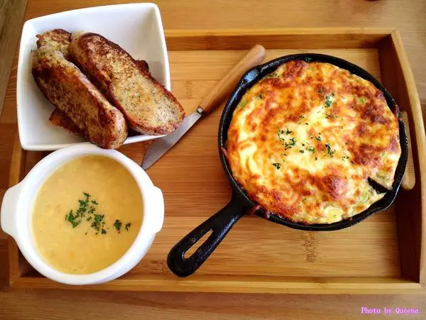 稍微焗烤過的烘蛋,口感不像炒蛋那般滑嫩,是外酥內Q保留點濕潤,並不會太乾唷!