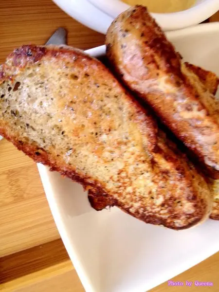 原以為有硬度的全麥法國麵包,竟然意料外的柔軟,單吃有著淡淡的香味越嚼越香
