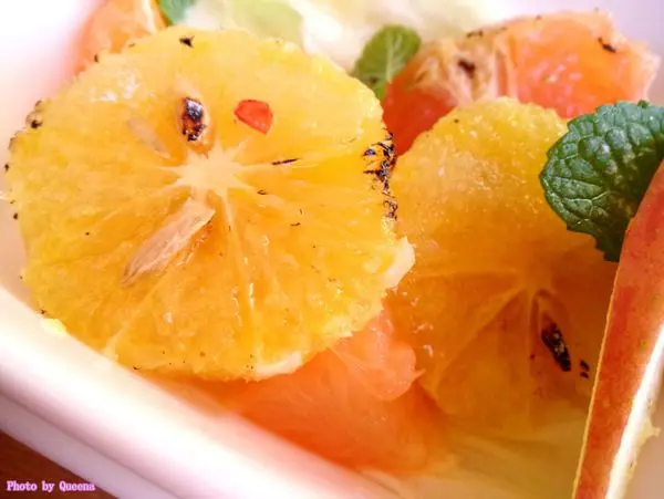 水果上層覆蓋了脆脆的焦糖,搭配水果原本的酸甜滋味更增加了甜度與口感