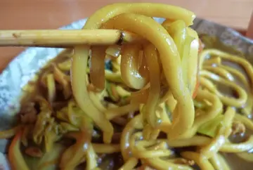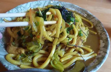 今天中午吃什麼?當然就吃咖哩烏龍炒麵,因為咖哩的味道濃郁幸辣,最近有些微涼,吃些咖哩可以和身体產生平衡. 好久沒有去中日和風飯館,這是淡大有名的日式料理店,雖然賣日式料理,但是價格不貴,是平價的日式料理店.而且湯和飲料免費暢飲取用,是消費很划算的日式料理店.咖哩烏龍炒麵所用的咖哩,是台灣一般常見的黃色咖哩,但是他們在烹調上用的巧妙,咖哩汁液和麵條充份結合,讓人享受咖哩的滋味,咖哩炒麵內還包含肉絲,魚板,高麗菜,感覺咖哩炒麵有種豐富的層次,而不單調,雖然80元,但是卻物美價廉.雞腿丼飯的雞腿用照燒方式烹調,有著濃郁的照燒味道,雖然只有單純的配菜和照燒雞腿,但是口感卻是豐富,滋味濃郁.中日和風飯館餐點眾多,價格便宜,每次中午下課,很多人把整個餐館擠得滿滿的.連走動舀個湯都不容易,我本來只偏好旁邊的幸宗日式料理,自從在這裡用餐後,我似乎被這裡的東西和價格給迷住,下次我還會再光顧.:)…查看更多