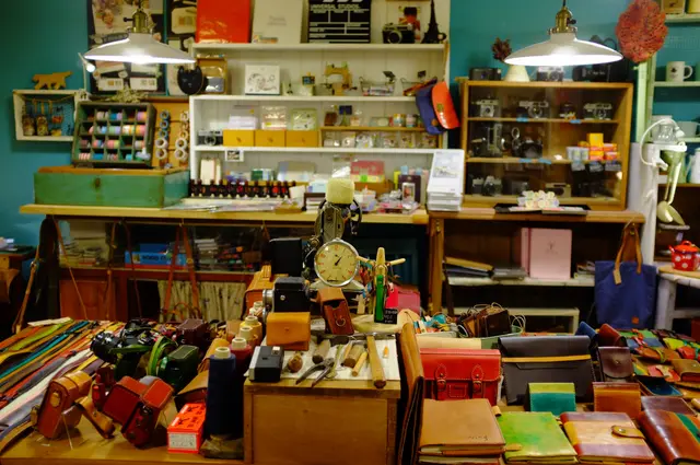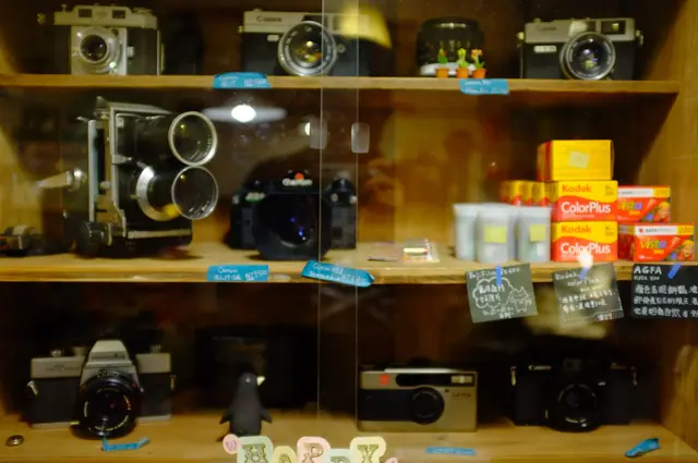 商品主力是相機的皮革相關產品,也有線上購買的專區,而櫃子也擺了些底片型的老相機。