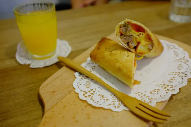 私藏捲餅 - 平日只提供單點的捲餅,看了菜單上的介紹就被吸引住了,有黑胡椒牛肉、鮪魚、德國香腸和迷迭香雞肉的口味,我選擇的是雞肉,上桌後若覺得份量太大也可以再請店家幫忙再切小份一點好入口。 上桌趁熱吃,可以吃到捲餅帶點咬勁的脆感,咬下去起司的香氣和蘋果的甜味以及雞肉的肉汁配合捲餅皮在口中讓人感覺到滿足,個人滿推薦的。