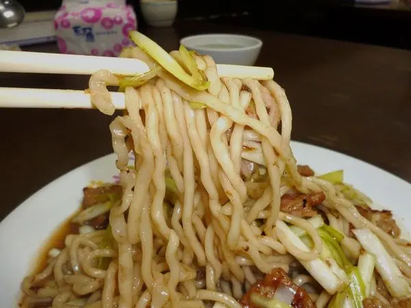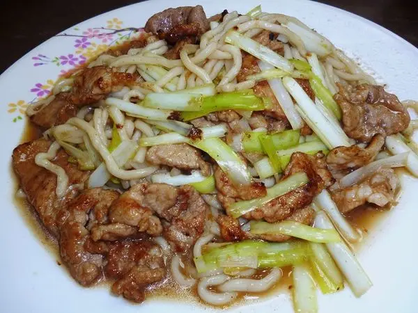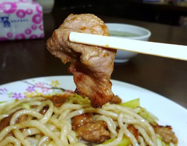 這是一道炒麵,以豬肉,韭黃為主,所搭配的麵條是白色拉麵,這整盤炒麵豬肉片份量蠻多,看起來香氣四溢,吃起來的口感,豬肉肉質軟嫩入味,充份吸收韭黃的滋味,白色麵條它也吸收豬肉和韭黃的湯汁,不但質感紮實順口,還帶有韭黃特殊的滋味.韭黃本身帶有特殊風味,經過熱炒加熱,把豬肉和整盤炒麵的美味提升出來.