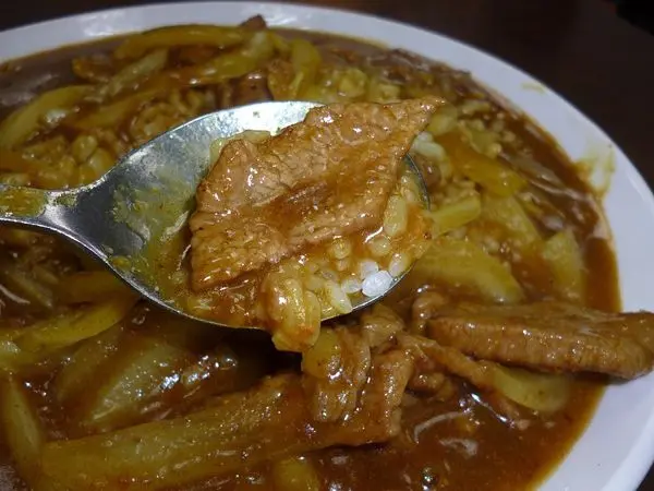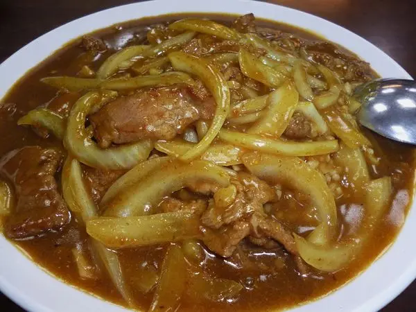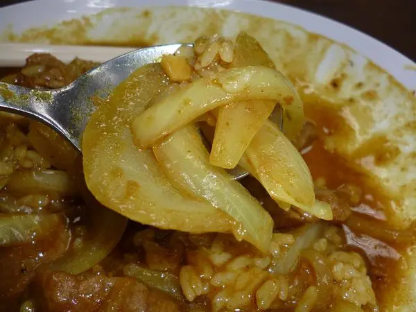 這整盤咖哩牛肉飯滿溢洋葱和咖哩湯汁,牛肉片份量也不少,吃起來的口感,咖哩湯汁帶著微辣,靠洋葱帶出香甜滋味,洋葱本身經過熱炒加熱,依然保持香甜的脆度,牛肉片充份吸收咖哩湯汁,肉質相當滑嫩入味.吃到最後白飯一定要拌著咖哩湯汁,才算是不浪費這道料理.
