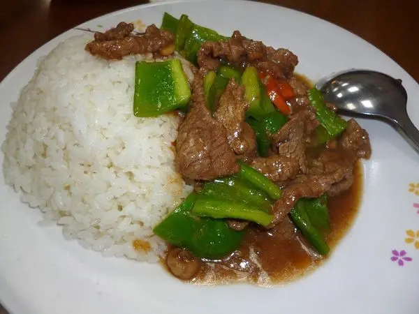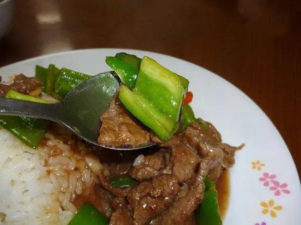 青椒牛肉飯是把牛肉片加上青椒熱炒後,再加在白飯上,青椒牛肉和白飯冒著騰騰的熱氣和香氣,綠色青椒切成塊狀,畫龍點睛的讓整盤快餐看起來生動許多.青椒雖然滋味特殊,經過熱炒,依然保持爽脆的口感,牛肉在青椒的陪襯下,依然軟嫩入味,但我比較喜歡咖哩的牛肉,因為牛肉的滋味多了一種微辣和咖哩香甜的滋味.比起青椒牛肉層次豐富許多.