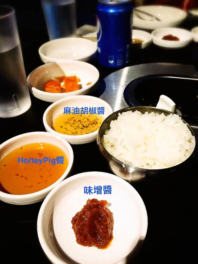 醬料的部分桌上本來只擺了HoneyPig醬,其他基本的麻油加胡椒醬及味增醬則是我另外跟服務生要才有,其實覺得有點奇怪,本來以為那個是基本的醬料.
