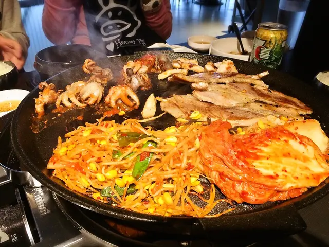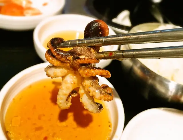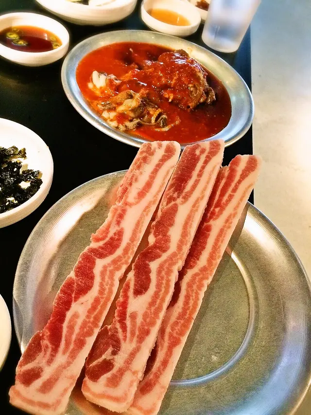就這樣我們的豬五花跟小章魚又重新開始燒烤一次,這次過程就順利許多,因為幫我們服務的韓國服務生明顯有經驗很多,肥嫩嫩的豬五花跟小章魚終於被我們吃到了!調味的部分我很喜歡,不會太鹹又有韓式特調醬汁的味道喔!