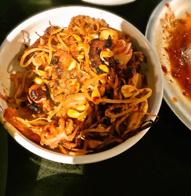 因為HoneyPig的燒肉,都是服務生親自桌邊服務,本來最期待的厚片豬五花,就這麼毀在剛開始幫我們烤肉的妹妹,他烤得時候感覺很緊張,看得我們也非常緊張,深怕我們的燒肉就毀滅了...果然烤到後來真的毀了...豬肉變得非常乾起烤焦了,旁邊的章魚們也是黑黑,呈現太熟的口感如下圖…