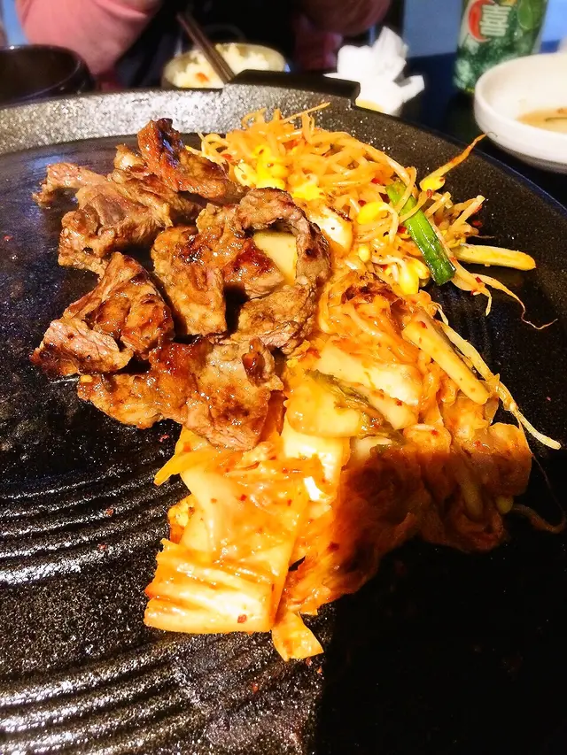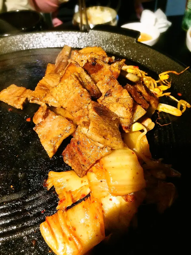我們實在太傻眼了,服務生妹妹也很緊張,後來有另一個韓國服務生來幫忙,妹妹竟然就直接丟下我們跑走了,這個時候鐵盤已經焦掉,因為剛剛火太大,需要換盤,我們趕緊跟幫我們換鐵盤的服務生反應,老闆直接走過來說再給我們一次豬五花,幫我們把焦黑的乾豬肉收走,結束這個慘案.