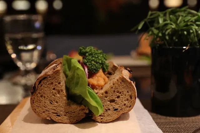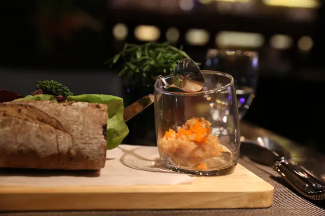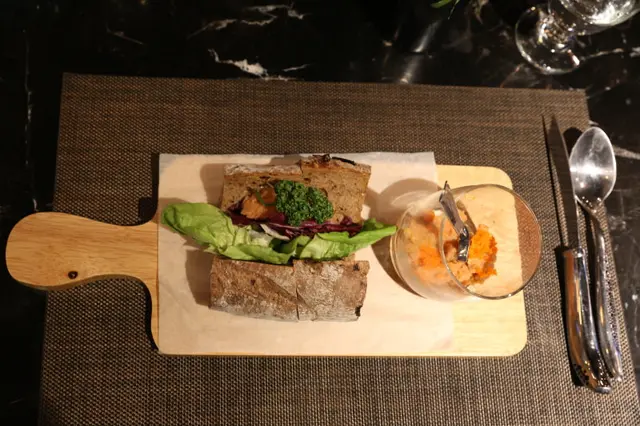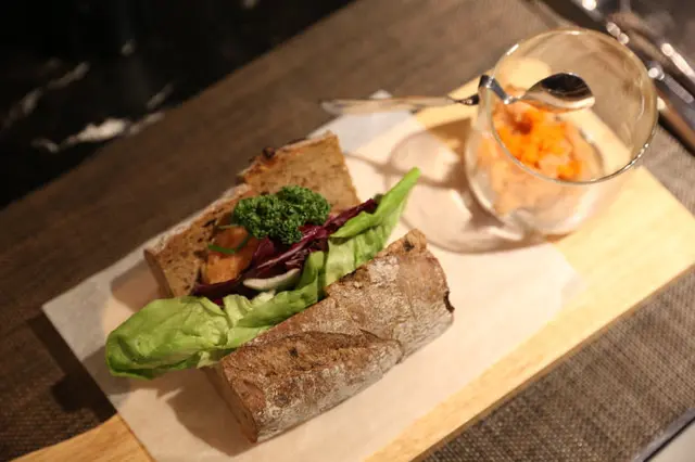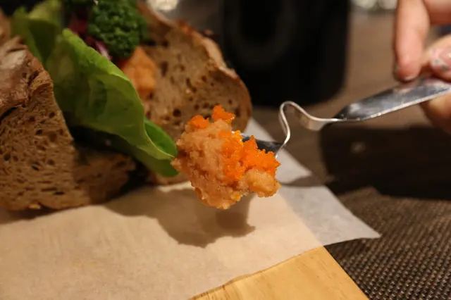 雜糧軟法剖開添入洗淨的蔬菜,一旁具有設計感的杯子裝著龍蝦沙拉和在嘴裡會波波波作響的魚卵