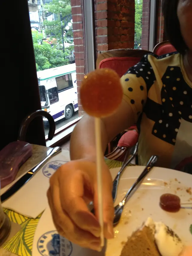 吃到一半,服務生開始逐桌發送小禮物(?),每人一根法式水果軟糖,有鳳梨和百香果兩種口味,但是服務生介紹錯,把鳳梨和百香果的顏色搞混,害我吃到鳳梨...這個法式水果軟糖樓下也有賣,滋味很不錯,酸得很過癮而且非常夠味,小小一口就可以吃很久,整個嘴裡面滿盈水果的滋味。