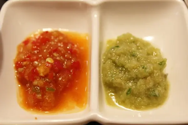 雞肉可以沾著泰式醬料和青蒜醬料一起吃