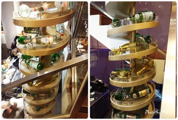 往二樓的樓梯旁的飲品製作區置放了一座旋轉酒架,