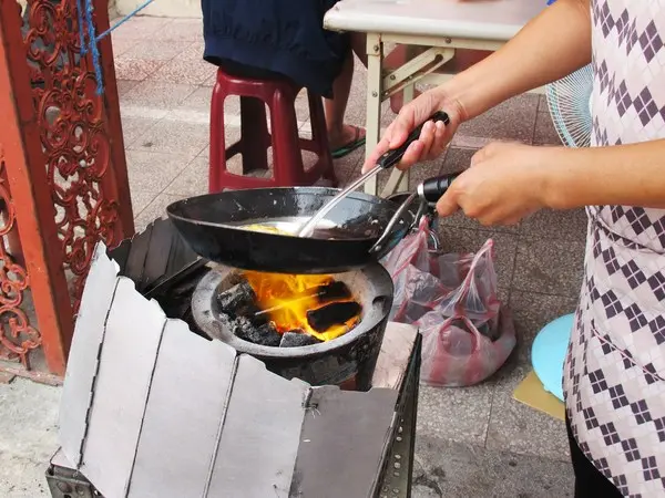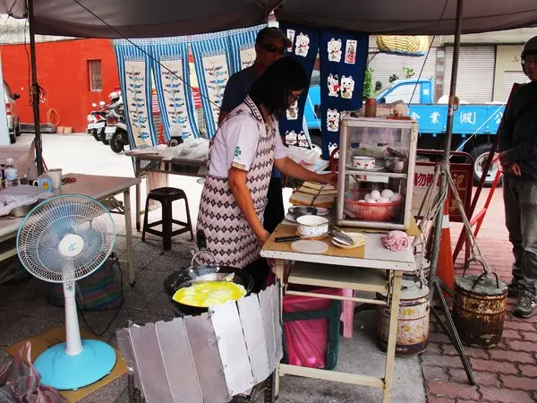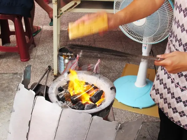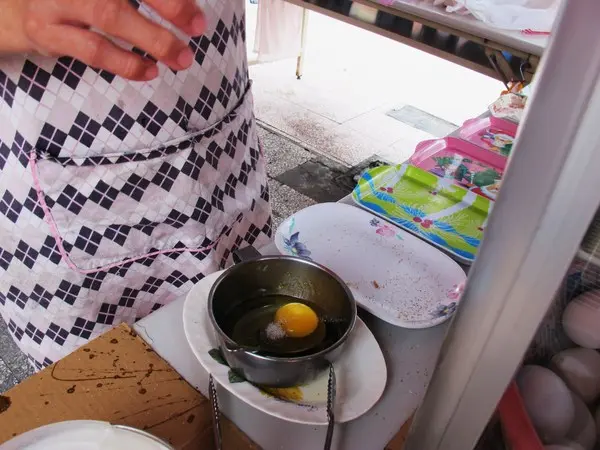 吐司夾進雞蛋後,烤肉鐵盤一夾,阿姨拿著夾著吐司的鐵夾。動作敏捷的 飛快 在 火爐上 翻轉。