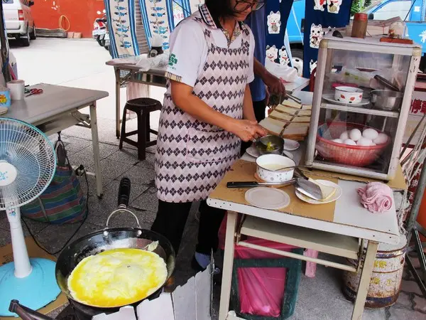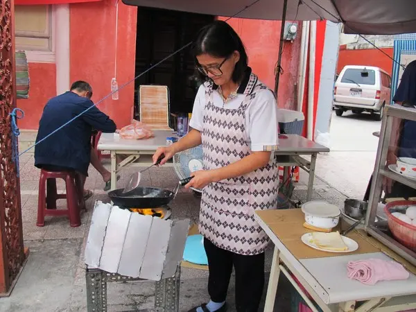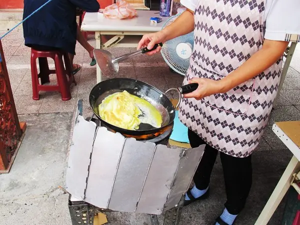 阿姨煎蛋。另一位叔叔在準備吐司。