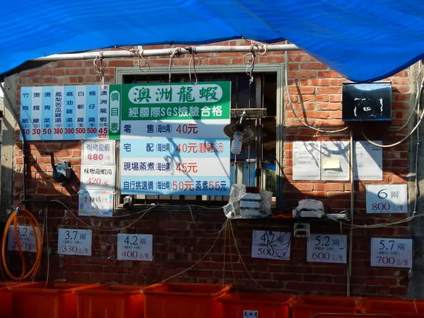 放眼望去盡是紅磚矮房,頗有農村氛圍。一旁一個個的橙色塑膠箱裡裝的就是不同重量的大閘蟹,當中還有一箱是澳洲龍蝦。原來查詢到的食記裡,只提及有提供大閘蟹和龍蝦料理,現在則多了些台式