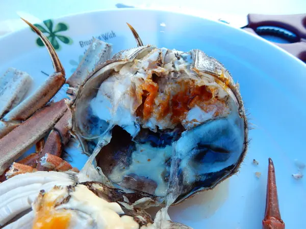 初次品嚐大閘蟹,依著在電視上習得的品蟹技巧,以工具先將蟹腳卸下後,接著揭開蟹甲,黃澄的蟹膏便淌了出來。心急地嚐一口,比沙蟹及花蟹濃郁數倍的膏腴風味盡漫舌尖,甚至如品嚐極富膠質的