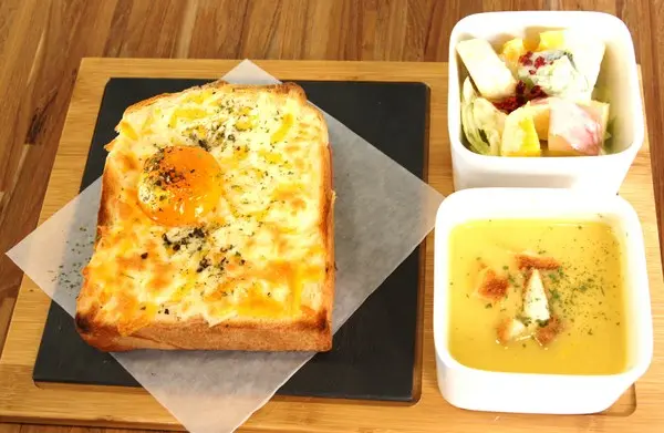 上方的半熟蛋,可搓破,然後把吐司切塊,沾取食用