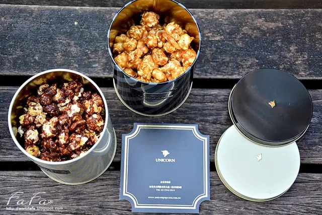 之前到京站看電影的時候就有發現旁邊有一家很華麗的"爆米花店"不過也沒有去詢問吃過這次剛好來嚐鮮看看位在威秀手扶梯上來的右手邊很奢華的一個小櫃位就是Unicorn法式爆米花的櫃位小小一區的空間卻極盡華麗裡面工作區是包裝爆米花的地方也透過透明玻璃窗呈現出商品的展示同時還有LED螢幕展示前方的半圓型桌子上有各種口味爆米花的展示現在搭配聖誕節的裝飾包裝不過小缺點是現場沒有價位展示好像只有賣鐵罐型的爆米花每個罐子都很精美這樣感覺比較適合送禮很可愛的裝飾後來仔細看才發現主角是爆米花!!現場店員都穿上歐風制服很搭配現場氣氛很親切地招待試吃 (不過整體包裝速度是有點小慢)爆米花的口為整體來說是比較偏甜偏鹹的鹹口味有墨西哥辣味 有著鹹香和淡淡的辣 味道稍為普普皇家印度咖哩 咖哩味道超級濃重 真的有在吃咖哩飯的感覺 感覺好神奇美式奶油鹽 這款反而覺得鹹度力道有點不夠 奶油味不夠重!甜口味有法式焦糖杏仁 好濃甜的焦糖味 味道是甜膩的那種 不過口味還滿不錯的濃情巧克力 也是走濃甜膩路線 如果能多些巧克力淡淡的苦味口味感覺會比較多層次芒果蔓越莓 芒果味很重 很甜膩 不過不會想像中太重的人工香味!愛戀草莓 就是草莓的香味 稍微普通然後他們的爆米花的硬脆度稍鹹不足有口感 不過也會有那種一點點無法一口咬動的感覺現場還備茶可以去去甜膩包裝是有質感的黑色提袋果然適合送禮!!小紙盒是試吃體驗盒黑白雙罐鐵罐可以確保爆米花不會受潮之後又可以再利用有質感也很美觀鐵罐內的爆米花還有另外用袋子包裝確保新鮮不受潮!!我選了法式焦糖杏仁和濃情巧克力~~他們的DM也都設計得很精美還有提供濕紙巾供吃完爆米花後使用?!另外還有提供專門的小卡片可以用在送禮時還滿貼心的!!…查看更多