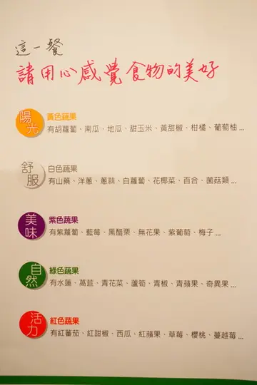 用心感覺食物的美好 以新鮮蔬果為食材,結合義大利料理烹調手法創作,強調五色(營養)、五味(香料)、五法(烹調) ,五彩繽紛、口味濃郁,兼顧「色、香、味、形、器」的整體表現。