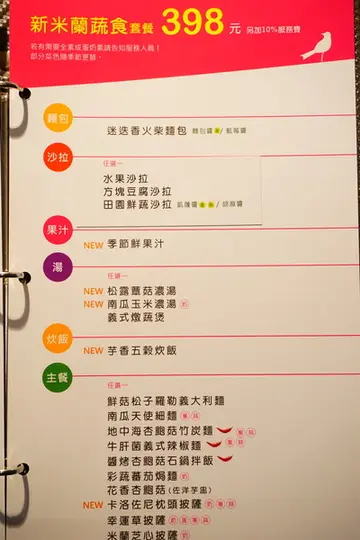 說道王品旗下的品牌唯一一間蔬食料理就是這一間啦~近捷運古亭站步行約2分鐘隱身在大樓中搭電梯到三樓就是瞜~~店內座位 店內比較昏暗走典雅乾淨的路線座位空間滿大的來看看【Menu】↓食材選用的部分新米蘭蔬食套餐 一份套餐包含餐前麵包、沙拉、果汁、湯、炊飯、主餐、甜點和飲品398元套餐+10%服務費另外也有提供單點~以下是點套餐398元套餐+10%服務費後面會附上單點價格唷:> 附餐飲品【柚香熱帶雨林紅茶】單點80元+10%本身無另外加糖可調整冰塊甜度來至柚子醬的味道喝起來酸酸甜甜的熱帶紅茶會帶有一點點柚子苦苦的味道不過還ok~滿不錯喝的:>餐前果汁感覺有加梅粉果肉的柳橙汁【迷迭香火柴麵包】單點80元+10% 搭配凱薩醬麵包滿好吃的帶點香料香氣餐前沙拉【方塊豆腐沙拉】單點100元+10% 豆腐沙拉滿有特色的!!!!三種不同口味豆腐軟軟的搭配醬料很不錯擺盤也很好看說!! 另外一款的餐前沙拉【水果沙拉】單點100元+10%水果沙拉感覺有加梅粉相較於豆腐擺盤略普通不過水果都很甜~~~附餐濃湯【南瓜玉米濃湯(奶素)】單點100元+10% 喝起來濃稠味道淡淡的南瓜甜香【芋香五穀炊飯】單點80元+10% 五穀飯qq有口感芋頭鹹香小小一碗不過真好吃:>【卡洛佐尼枕頭披薩(奶蔥蒜素)】單點260元+10% 枕頭披薩好好吃!!!還沒切開蓬蓬的像是枕頭一樣真可愛 切開後起司緩緩流出><!!! 酥酥的披薩薄餅內容有各種菇類、年糕、花椰菜、番茄等等餡料豐富!!!搭配起司和咖哩雖然是素食料理卻讓人好滿足!! 【當紅豆遇到黃豆(蛋素)】單點80元+10% 沒吃~~是將豆花和紅豆泥作組合感覺頗特別的>< 【芒果千層(奶蛋素)】單點80元+10%卡士達和芒果除了QQ麵皮外還放了千層酥 口感有不一樣的變化吃起來冰涼甜度適中~【結論】:是聚餐慶祝的好所在以蔬食為主但是一點也不平凡呢:3 環境方面舒適的餐廳環境服務方面10%服務費態度親切有禮餐點方面每一道餐點都表現可圈可點(幾乎沒什麼地雷)均一的品質味道都滿不錯的套餐下來分量十足特別喜歡主餐的枕頭披薩~好吃又有特色!!明明是蔬食料理卻覺得很不簡單介紹給大大參考謝謝大大的閱讀~~~查看更多
