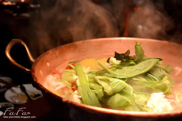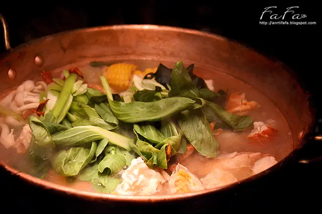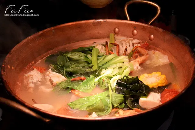 有蝦有蟹腳、蛤蜊、南瓜、豆腐、蒟蒻、海帶芽、玉米、美白菇、青江菜、白菜...