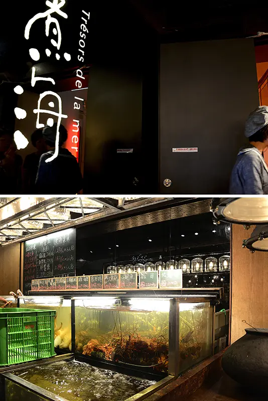 煮海外頭有著玻璃水缸,上方還用黑板標示品名價格,乍看就像是海產店。