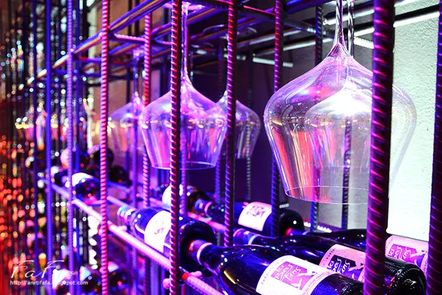 一入門口上樓梯便會看到這些鋼筋製作的酒架,打上紫色燈光宛如虛幻的夜店風格。