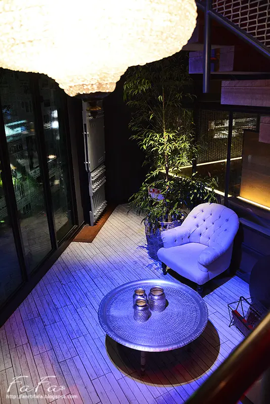 二樓往三樓處這三角形區塊,不鏽鋼桌、沙發椅,上頭還有華麗水晶燈,
