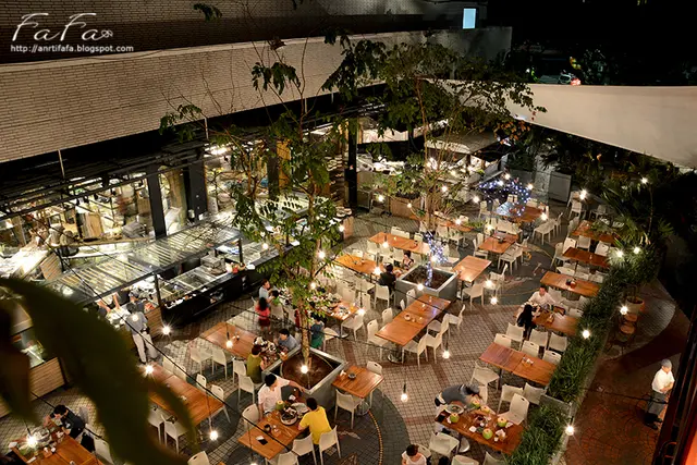 往下一看則是備長炭燒烤海鮮戶外區,同事表示從上方看著這些點點燈飾很漂亮。