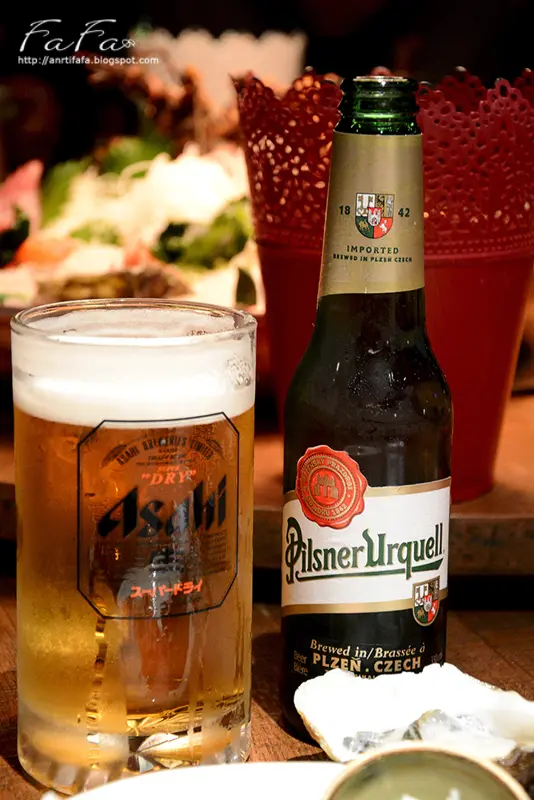 Asahi生啤與皮爾森歐克(Pilsner Urquell)瓶裝啤酒。