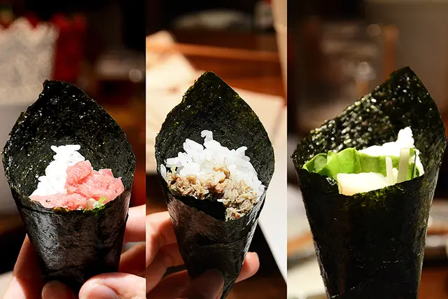 鮭魚卵NT$80、辣鮪手NT$80、酪梨蟹肉NT$90、加拿大海膽NT$100、馬糞赤海膽NT$150