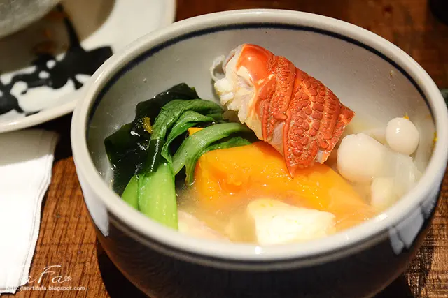 這鍋是利用一開始海鮮盤上的龍蝦頭熬煮而成,