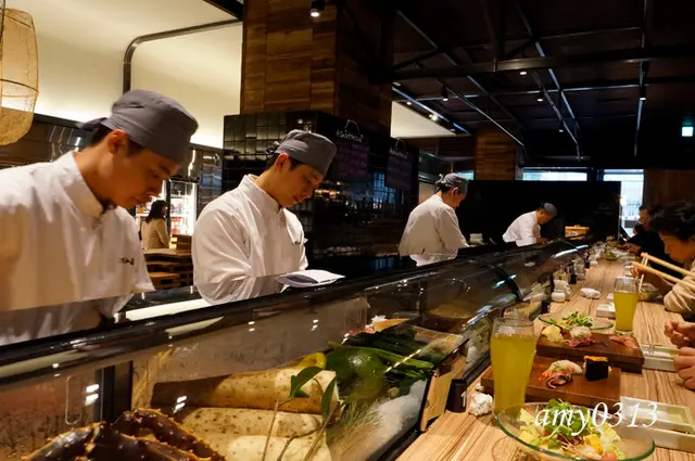 『上引水產』裡總共有70個立食的位子,卡布里台有12公尺長呢~。