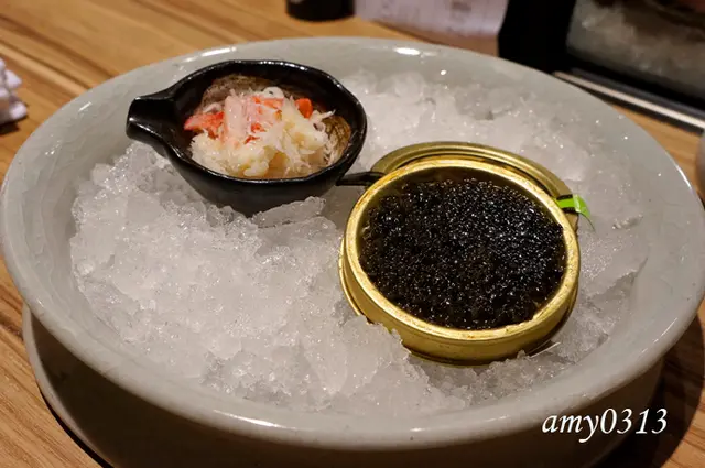 這天兩人點了一份$1980的立吞套餐和一份$600的特選握壽司,照片中是立吞套餐的前菜。原本看美食記者的部落格上寫著這份套餐的前菜有魚子醬、松葉蟹和一小盒海膽,結果我們的只有松葉蟹和魚子醬,沒有海膽,怎麼是不是記者差這麼多呀?魚子醬還可以,松葉蟹沒有想像中好。