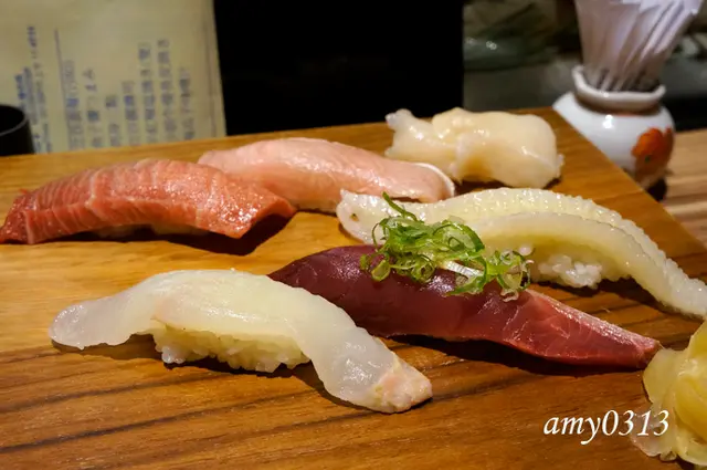 立吞套餐裡的握壽司。承襲了三井的傳統,『上引水產』的魚肉給的也很大器,鮮度也很不錯,吃起來很過癮。