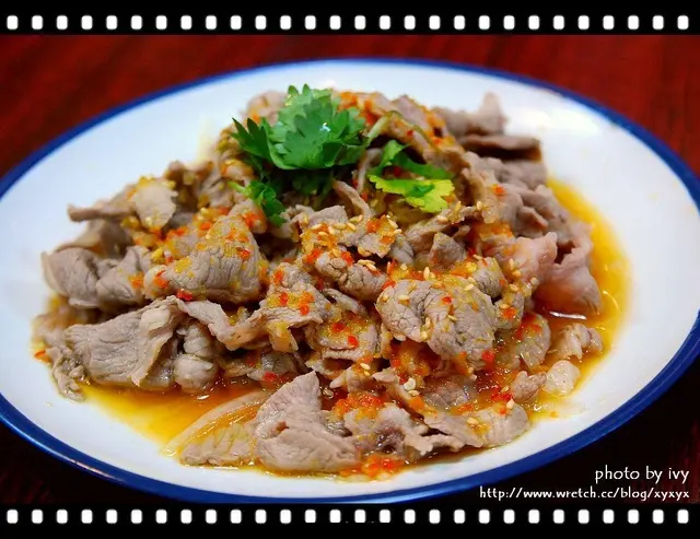 羊肉片涮熟後以生洋蔥墊底、淋上特調泰式醬汁、最後灑上白芝麻與香菜增加香氣