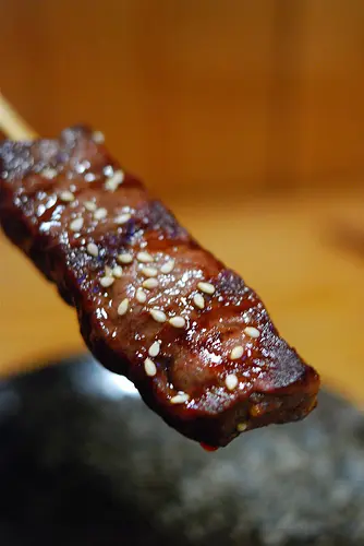 一邊拿起來、肉汁一邊從牛肉串上滴下~~~