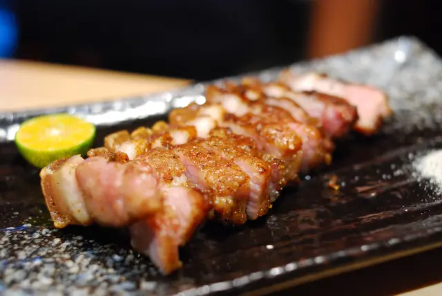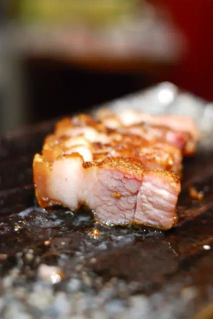 豬肉同樣也帶著美麗的紋理,肥瘦參半,肥肉/脂肪的部份烤到Q彈,入口香而有咬勁,