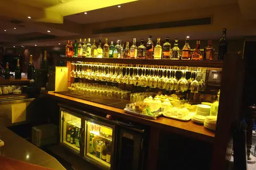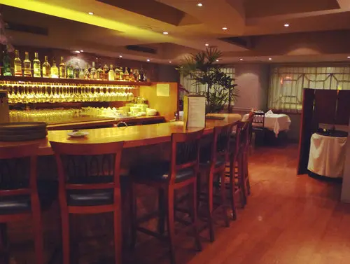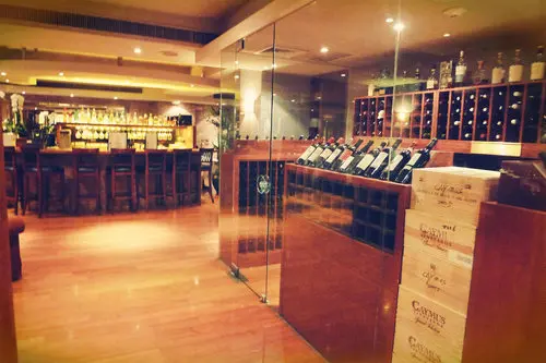 這裡大量使用木質的裝潢,高腳椅與透明的酒櫃廚窗,