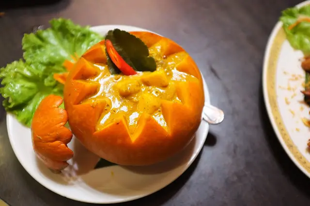 咖哩南瓜牛肉 $480 阿明師的經典之作之一,將食材當作容器在視覺上就先吸引了目光,咖哩裡有許多的食材,最特別的是還有加入花生,很下飯的一道菜。