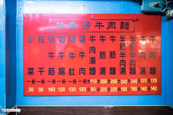 【林東芳牛肉麵】店內主打牛肉麵與半筋半肉麵;喜歡牛筋的朋友也有牛筋麵與不吃肉的湯麵選擇,小菜總類也不少有豬頭皮、海帶條、小黃瓜...等等。價位方面果然是名店的價位,大小碗價差跟牛肉還有麵的份量也有相關,店內的湯頭限加一次,本次品嚐半筋半肉搭配招牌花干,多點一份牛肚來品嚐。