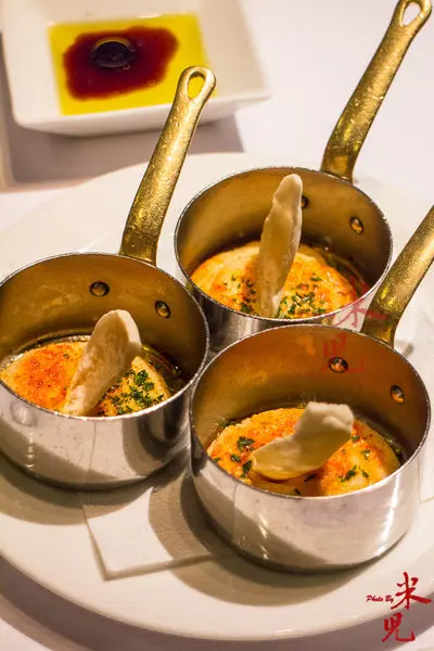 西餐總廚Thomas Chiu把現在在世界各地十分流行的「多國料理」元素融入前菜當中,所以前菜的菜單裡頭,多了洛克斐勒生蠔與焗大彩蛤、迷你肉丸烘蛋、炙燒北海道干貝等,光是看著菜單就每種都想吃,很難決定到底要吃什麼!而湯品部分,我當然還是死忠於我最愛的經典洋蔥湯,但是這次新推出的奶油番茄湯也不賴;而新口味的沙拉當中,野菜沙拉挑選了多種有趣奇妙又可口的有機蔬菜,搭配溫熱的醬汁食用,不僅擺盤視覺效果好,吃的時候也有種尋寶的樂趣;可惜套餐裡的湯和沙拉只能二選一。