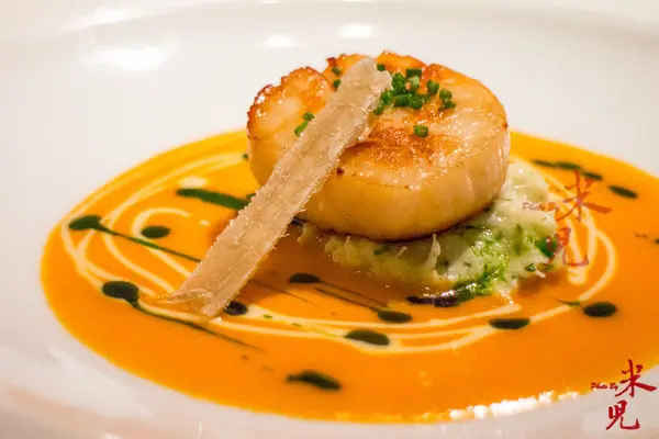 炙燒北海道干貝很受歡迎,不過主廚有了新的搭配,是用法式手法呈現,煎過的干貝底下,是用冰島鱈魚醃過後再加牛奶煮入味,最後打進馬鈴薯泥裡,再配上番茄蛤蜊醬汁,上面那片則是師傅巧心製作的薑糖片,很有意思,當然,層層風味也非常迷人喔!