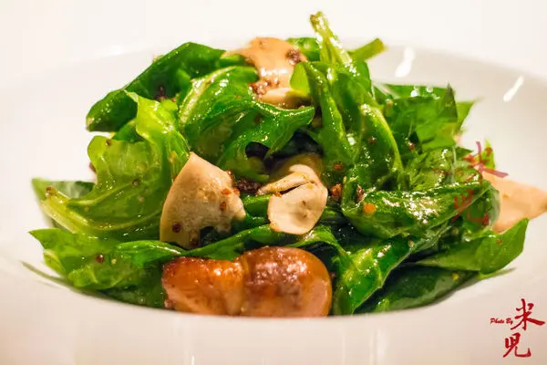 溫菠菜沙拉,米兒很不喜歡吃炒的菠菜,但極愛溫菠菜沙拉,可是國內很少餐廳吃得到,這裡的溫菠菜沙拉搭配了香檳茸,香氣更豐富,芥茉籽醬汁吃來很爽口。